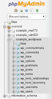 The phpMyAdmin administration page appears in a new window. In the left pane, click the name of the database that contains the table you want to delete. For example, the following image shows the example_wordpress database selected: