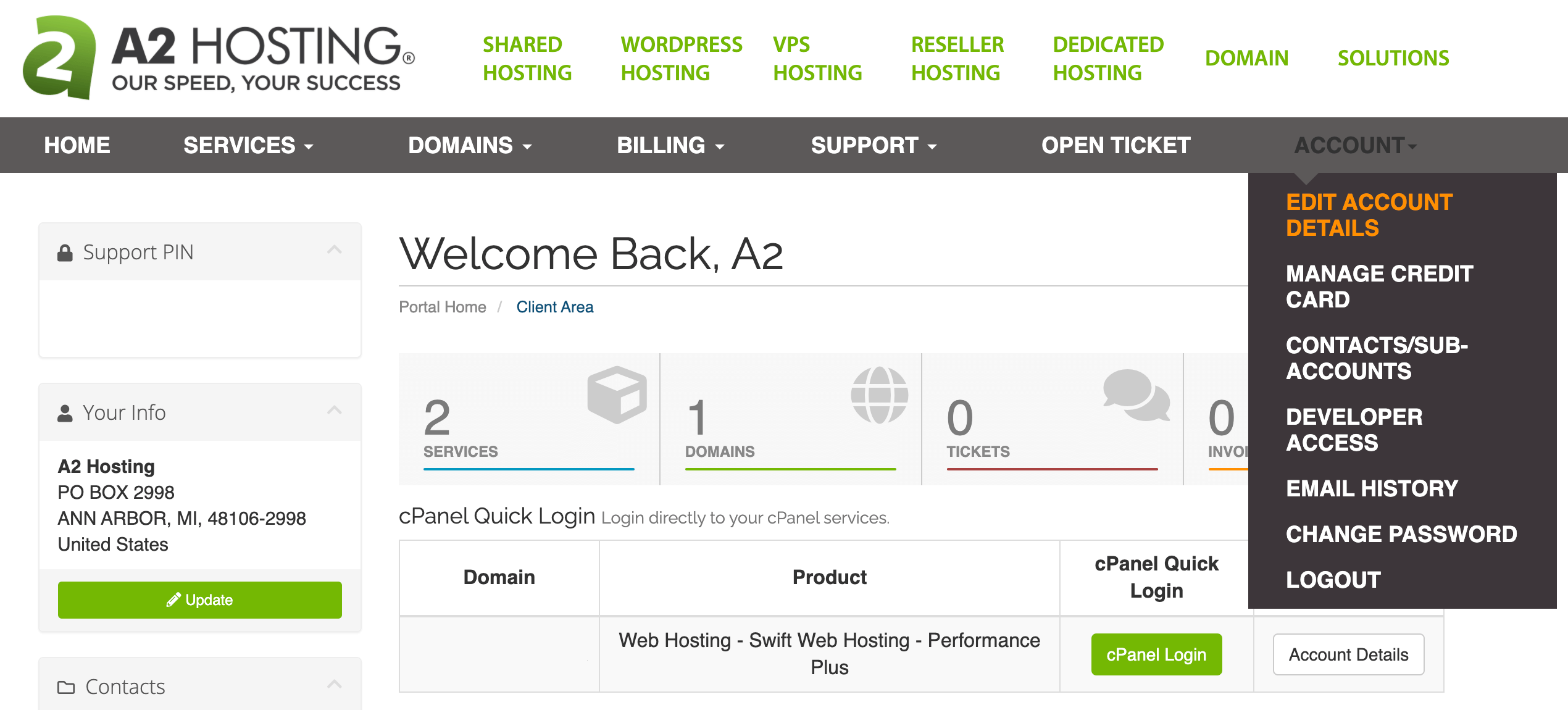 After installing your chosen mobile app, A2 Hosting customers can enable 2FA by logging into their accounts and navigating to Account > Edit Account Details. You can then select Security Settings in the left-hand menu: