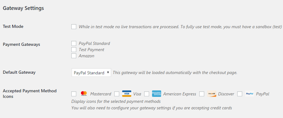 The last thing you’ll need to do before making your first sale is decide how you’ll get paid. The free version of Easy Digital Downloads enables you to use PayPal and Amazon Payments to process orders.