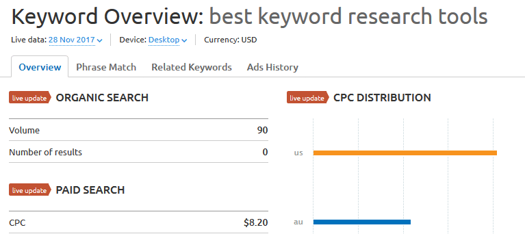 In this case, we went with best keyword research tools once more, so we could compare these results with the ones Moz gave us. Right off the bat, SEMRush’s volume estimates are a lot less conservative: