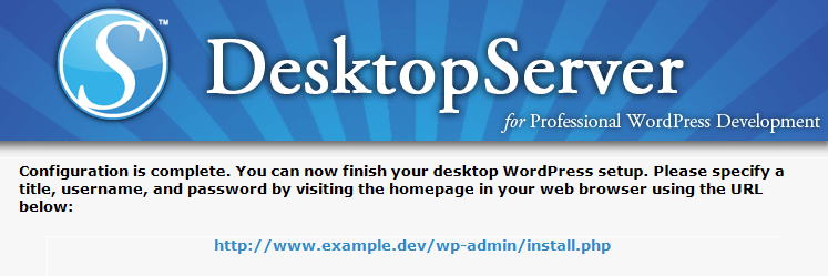 When you’re ready, click on Create and let DesktopServer work its magic. Wait a minute until you see a success message, and click on Next one final time. The setup wizard will display a link that you can click on to initialize the WordPress installer now: