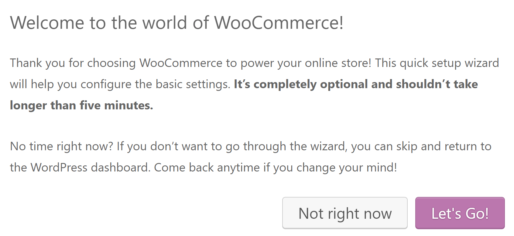 As soon as you hit the activate link, WooCommerce will send you into its setup wizard. You can always configure your store manually, but we recommend giving the wizard a go if it’s your first time using the platform. Let’s check it out together by clicking on Let’s Go: