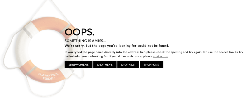Links to the company’s various apparel departments are included on its error pages. By doing this, the site is giving visitors options. They can each choose a link that’s relevant to their needs, and they may even encounter new products they wouldn’t have otherwise considered.