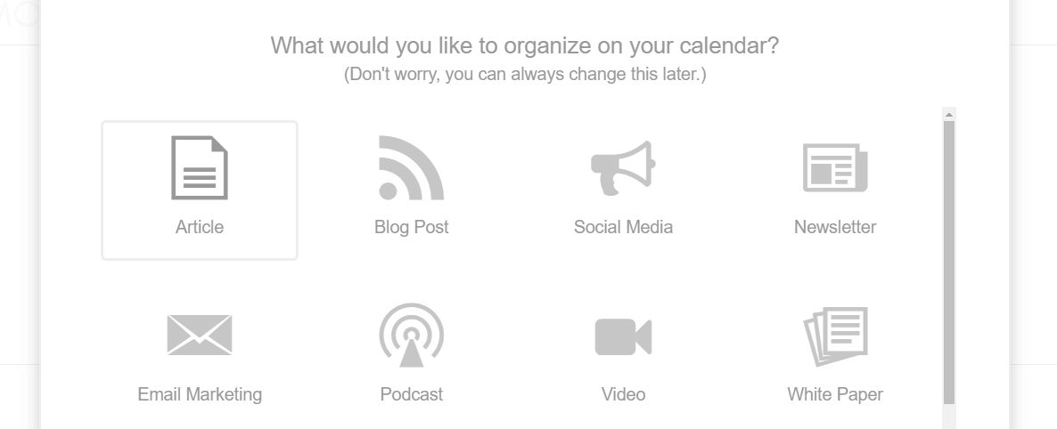Once you’ve named your calendar, CoSchedule will walk you through a brief configuration wizard. Here you can determine how many members your team contains, and select the type of content you’re working with:
